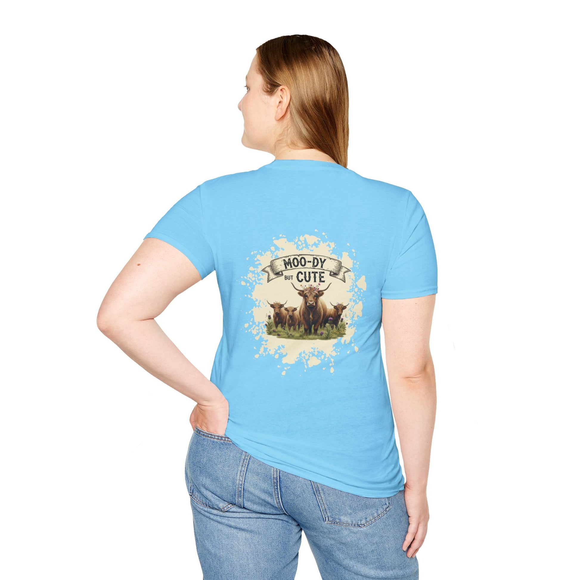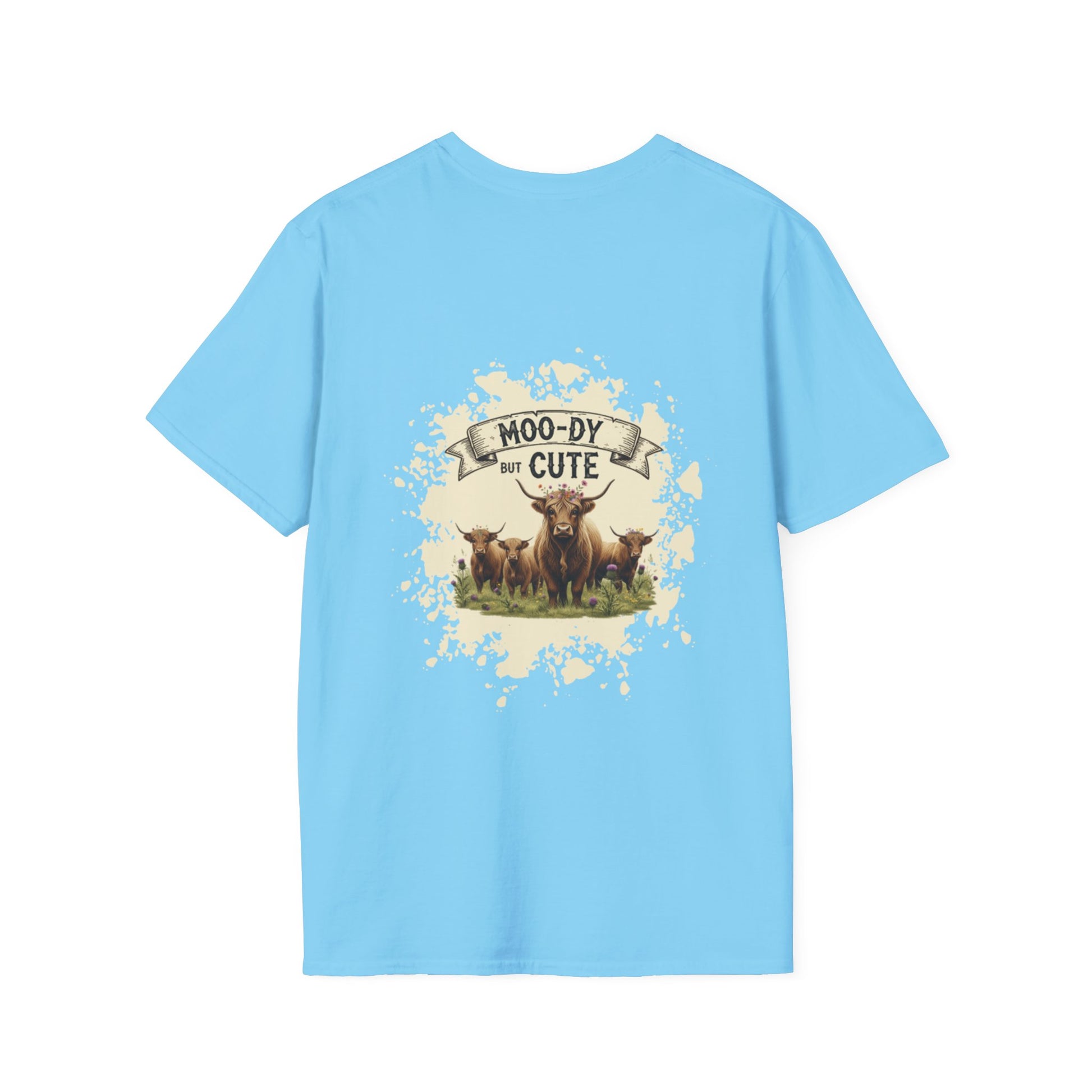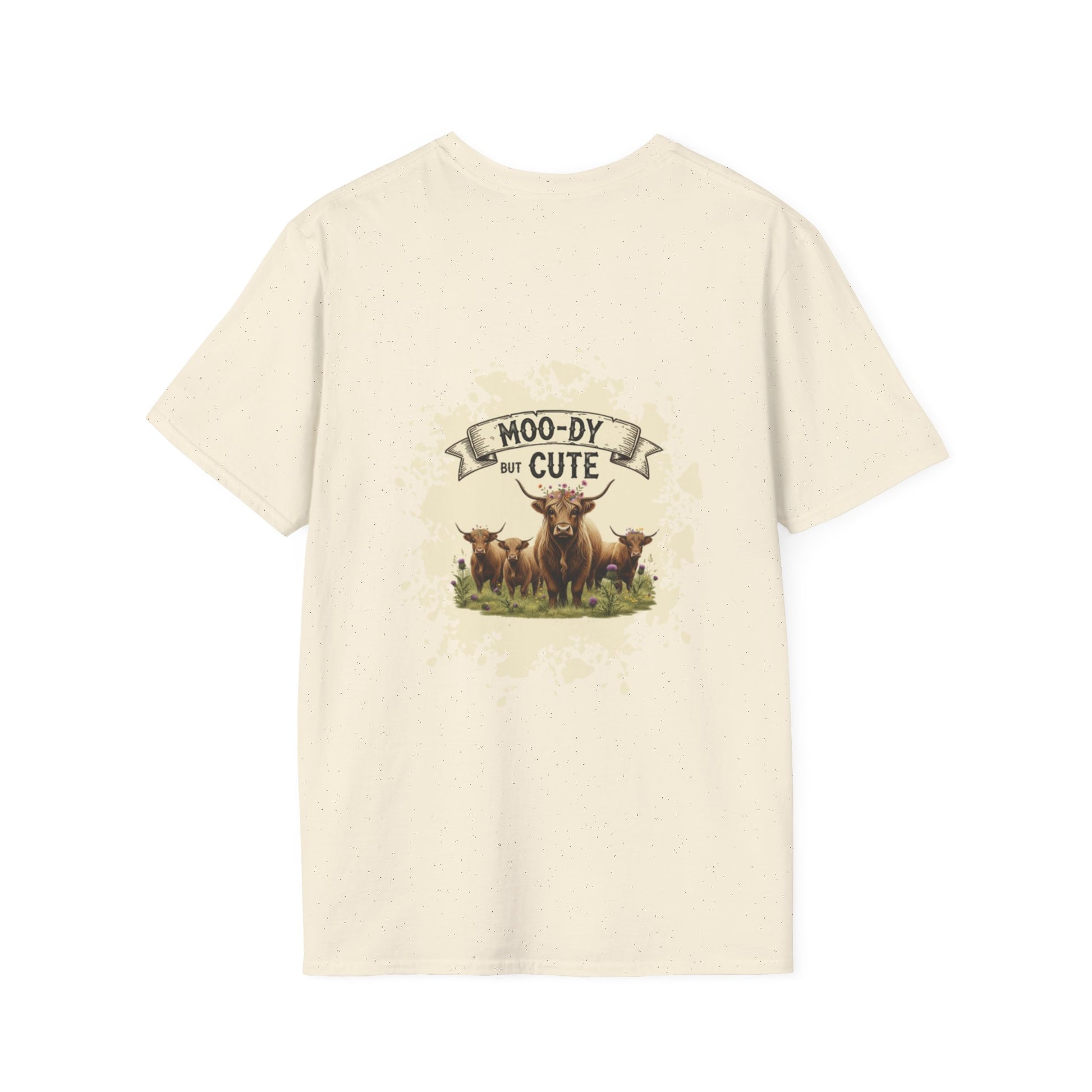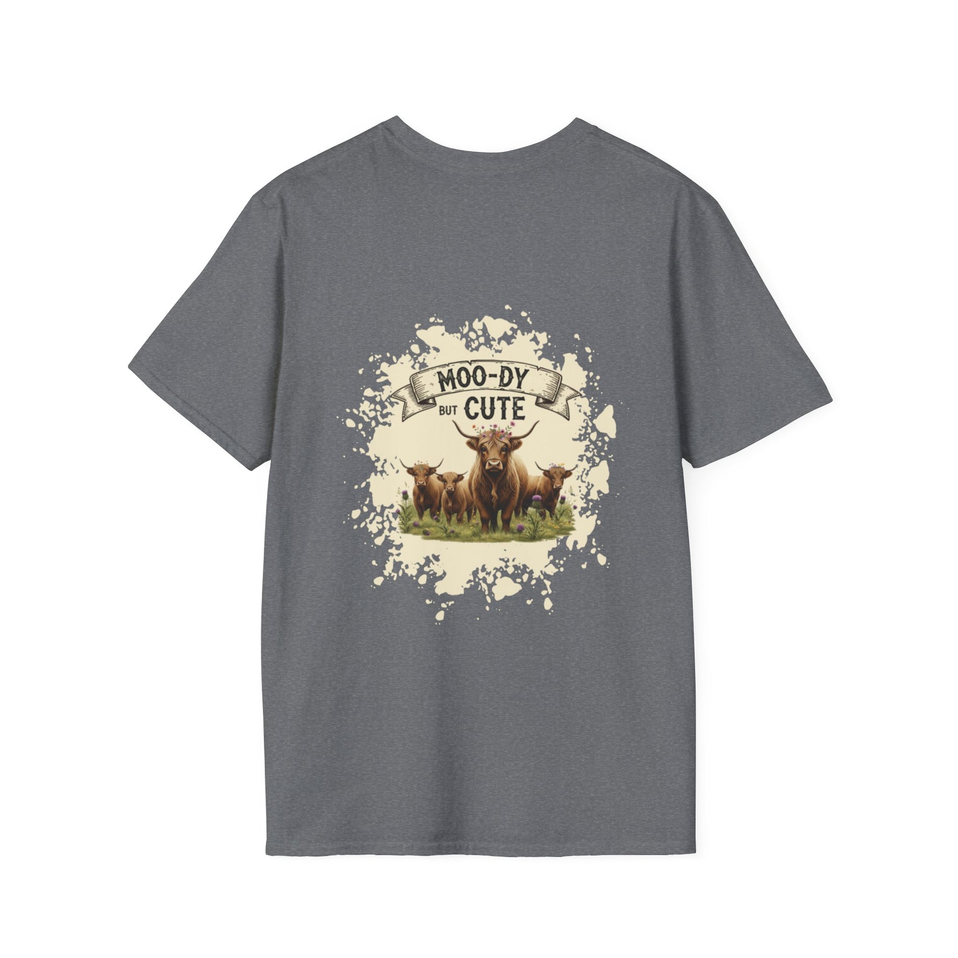 Moo-dy but Cute t shirt featuring highland cows, perfect for those who love animals and want to add a touch of whimsy to their wardrobe. This comfortable and versatile garment is ideal for casual wear and can be a great gift for animal lovers or anyone who enjoys playful designs. Suitable for holidays, birthdays, or any casual occasion.