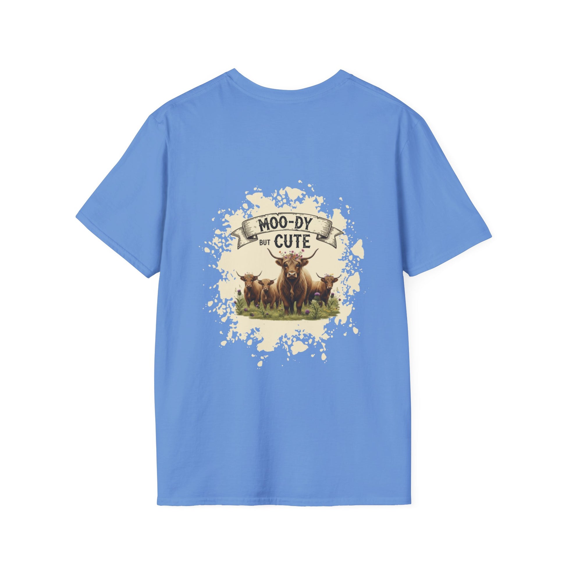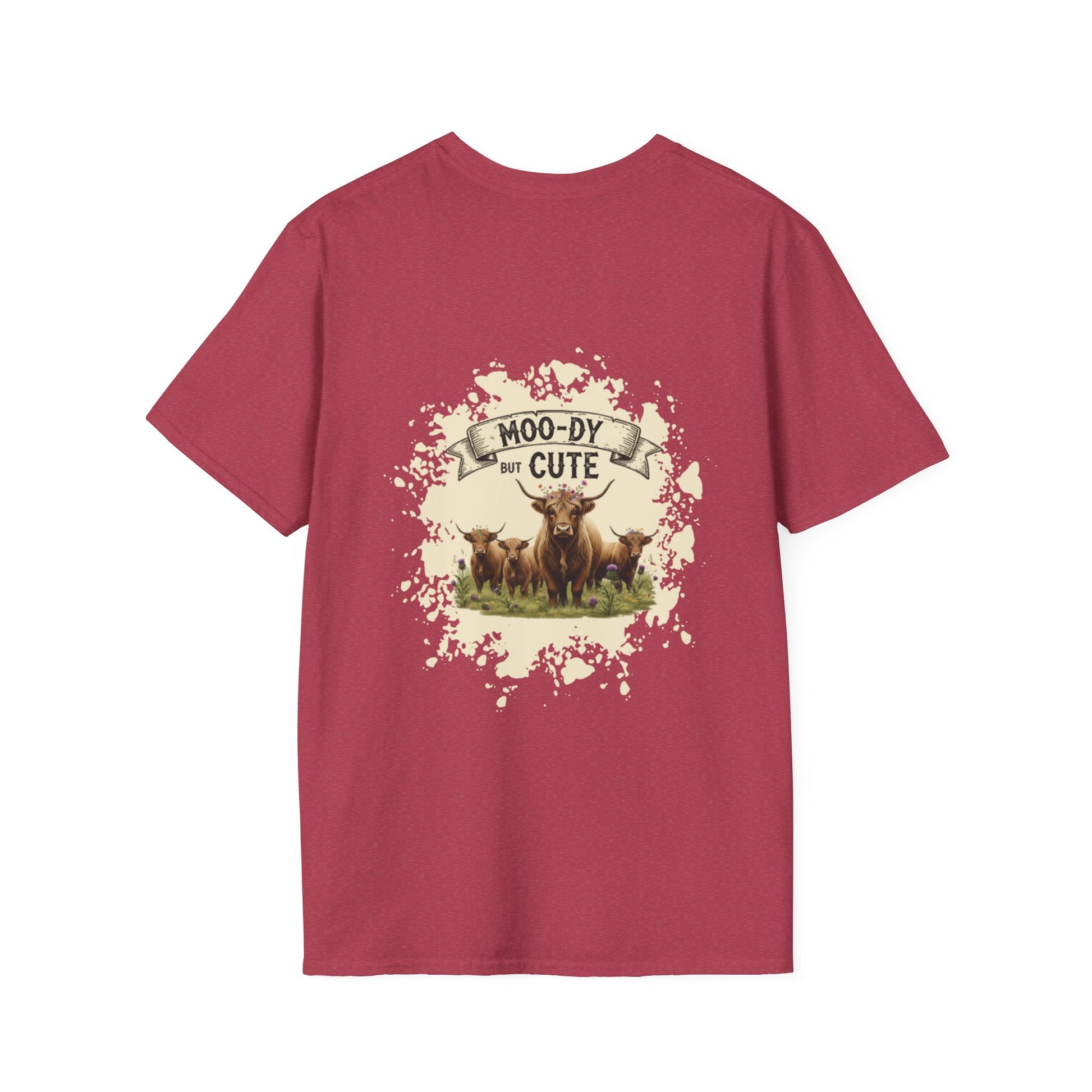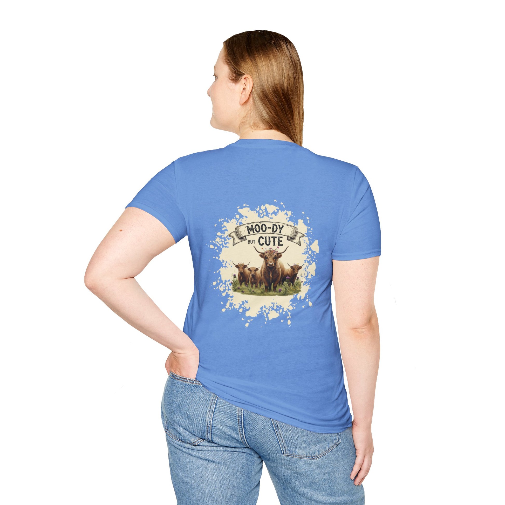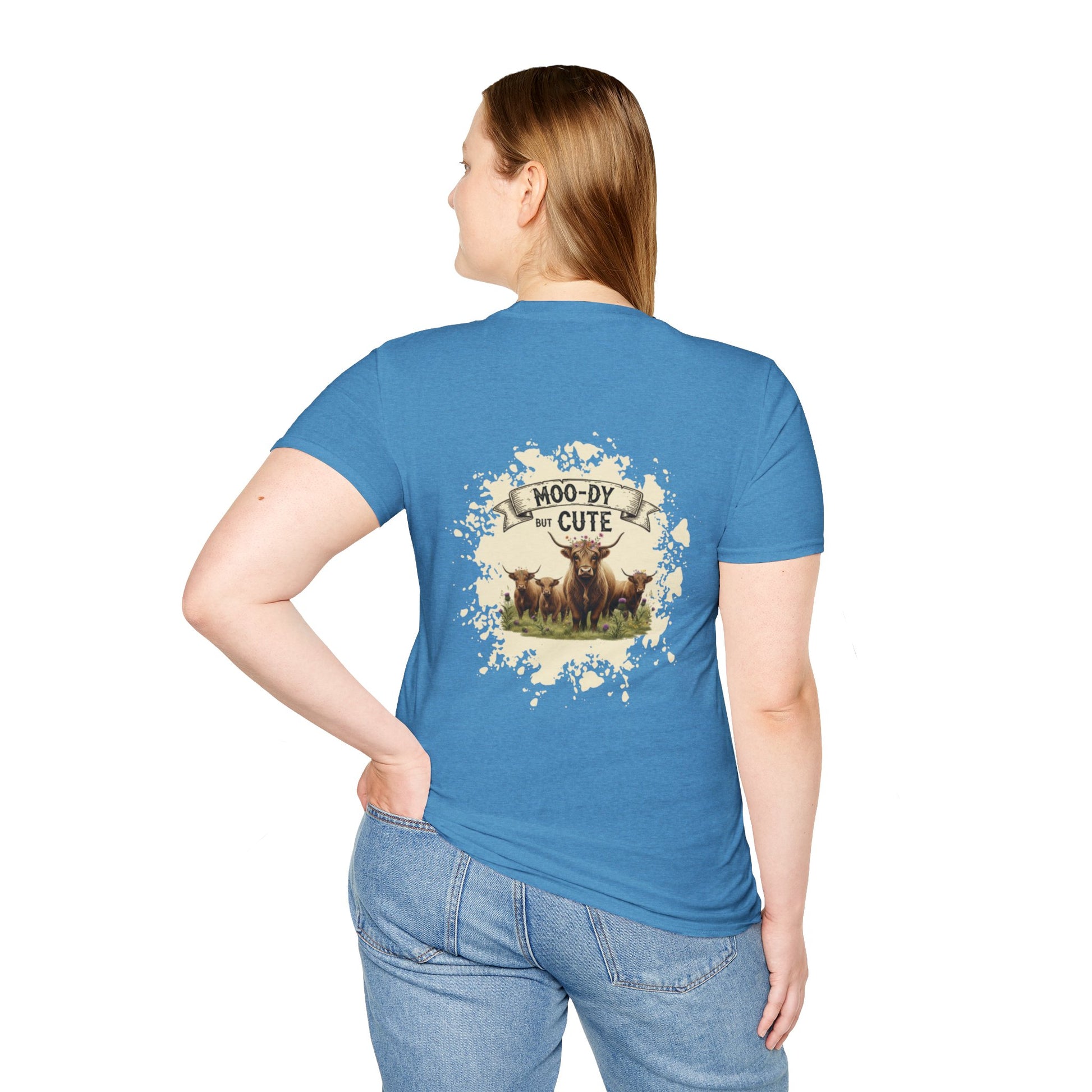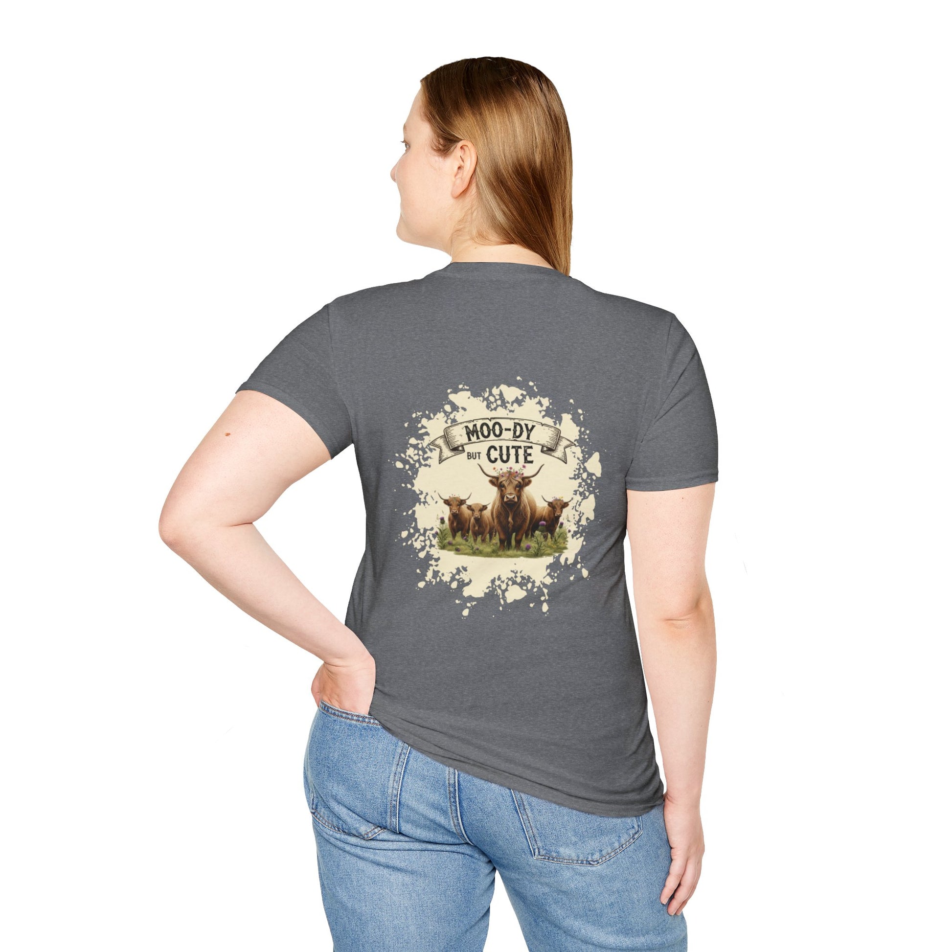 Moo-dy but Cute t shirt featuring highland cows, perfect for those who love animals and want to add a touch of whimsy to their wardrobe. This comfortable and versatile garment is ideal for casual wear and can be a great gift for animal lovers or anyone who enjoys playful designs. Suitable for holidays, birthdays, or any casual occasion.