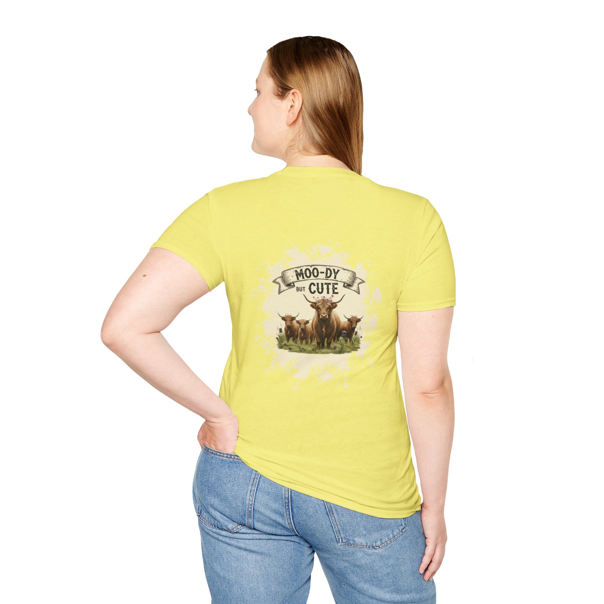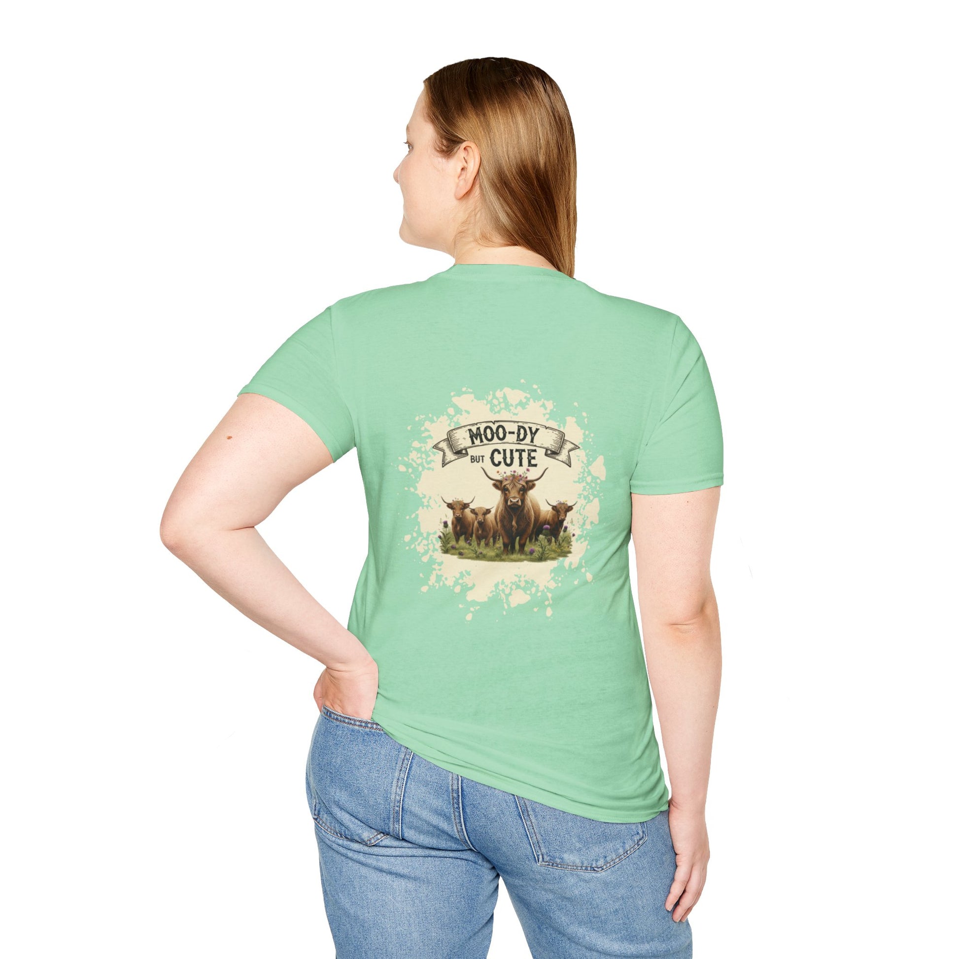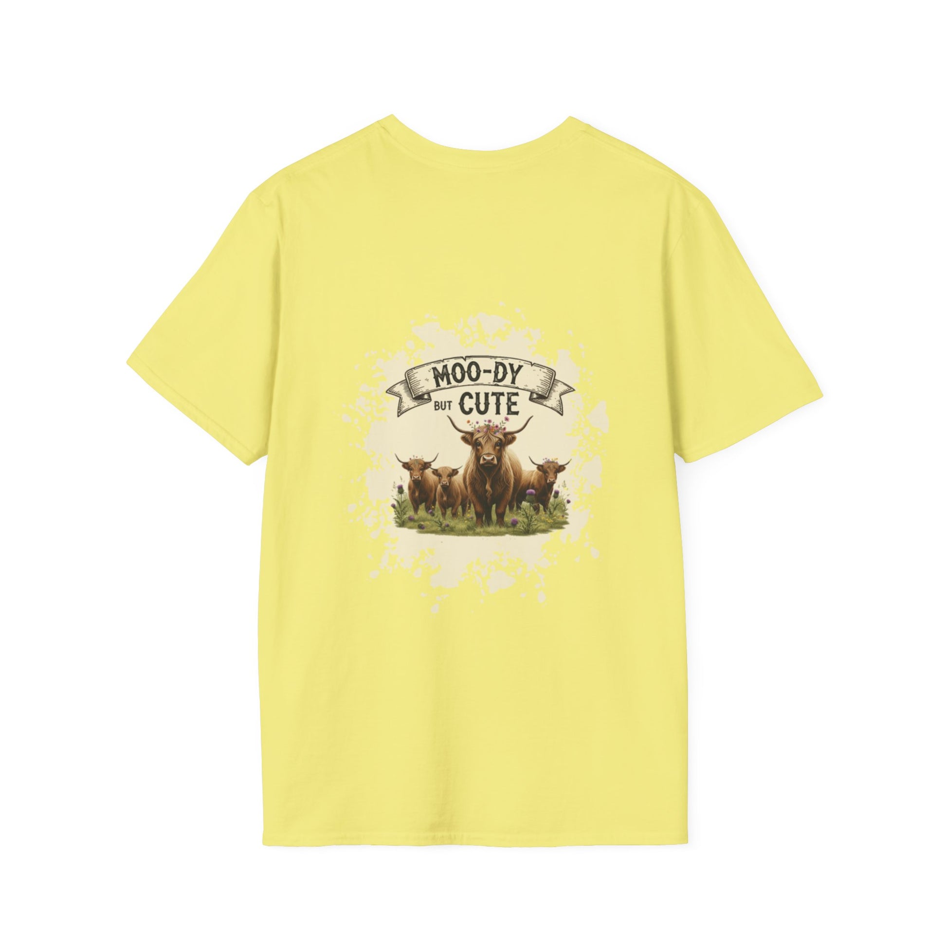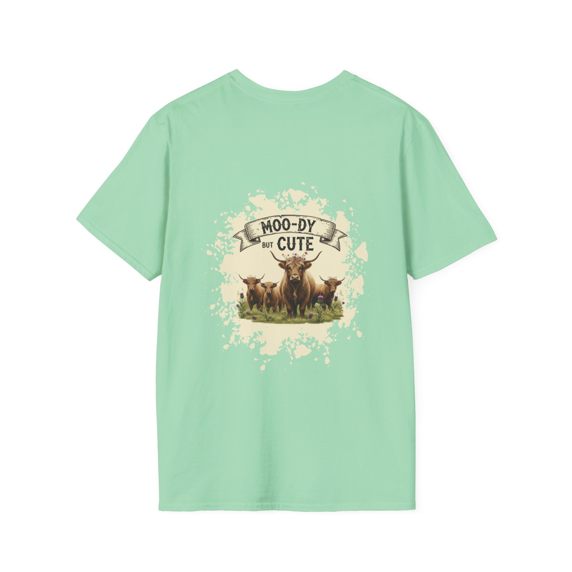 Moo-dy but Cute t shirt featuring highland cows, perfect for those who love animals and want to add a touch of whimsy to their wardrobe. This comfortable and versatile garment is ideal for casual wear and can be a great gift for animal lovers or anyone who enjoys playful designs. Suitable for holidays, birthdays, or any casual occasion.