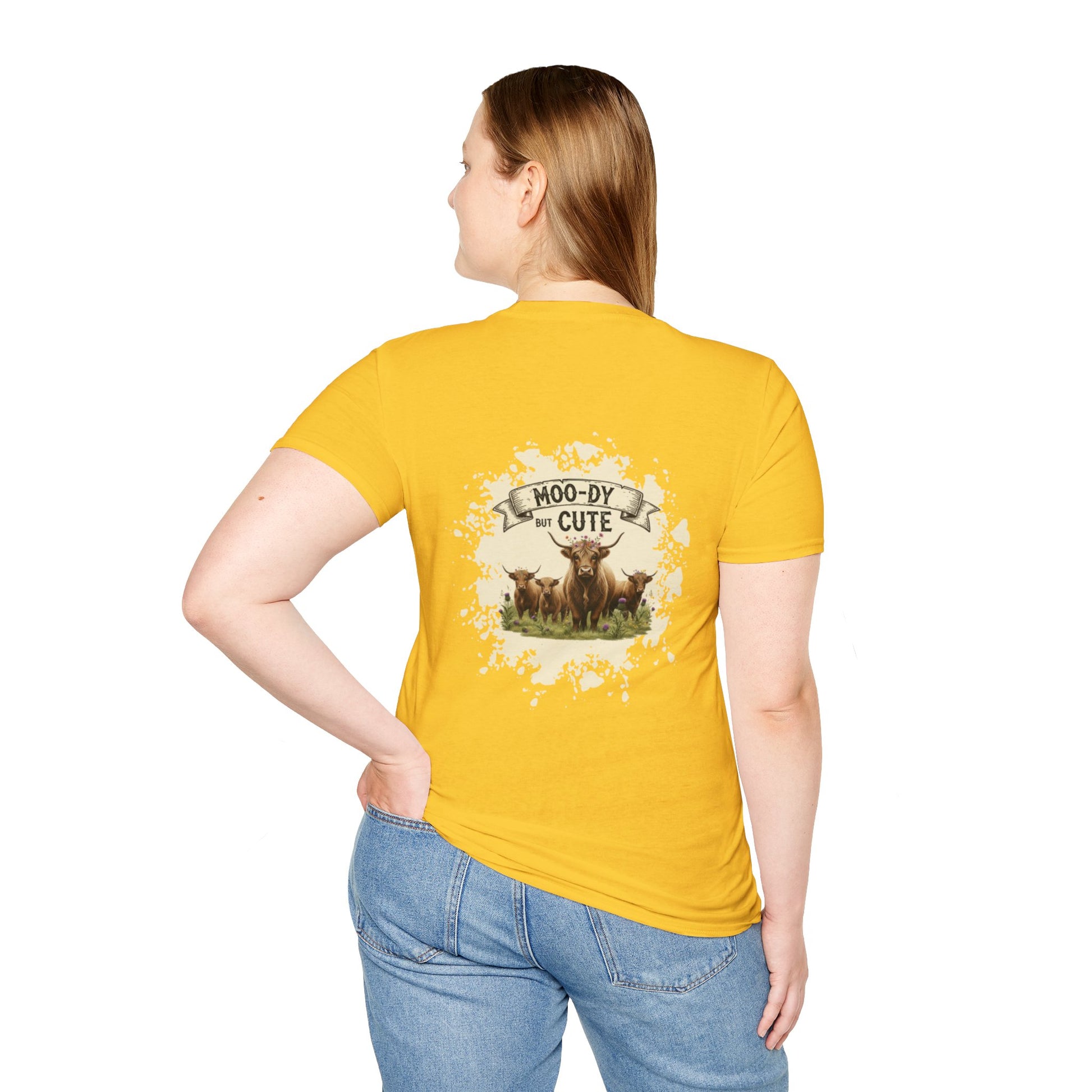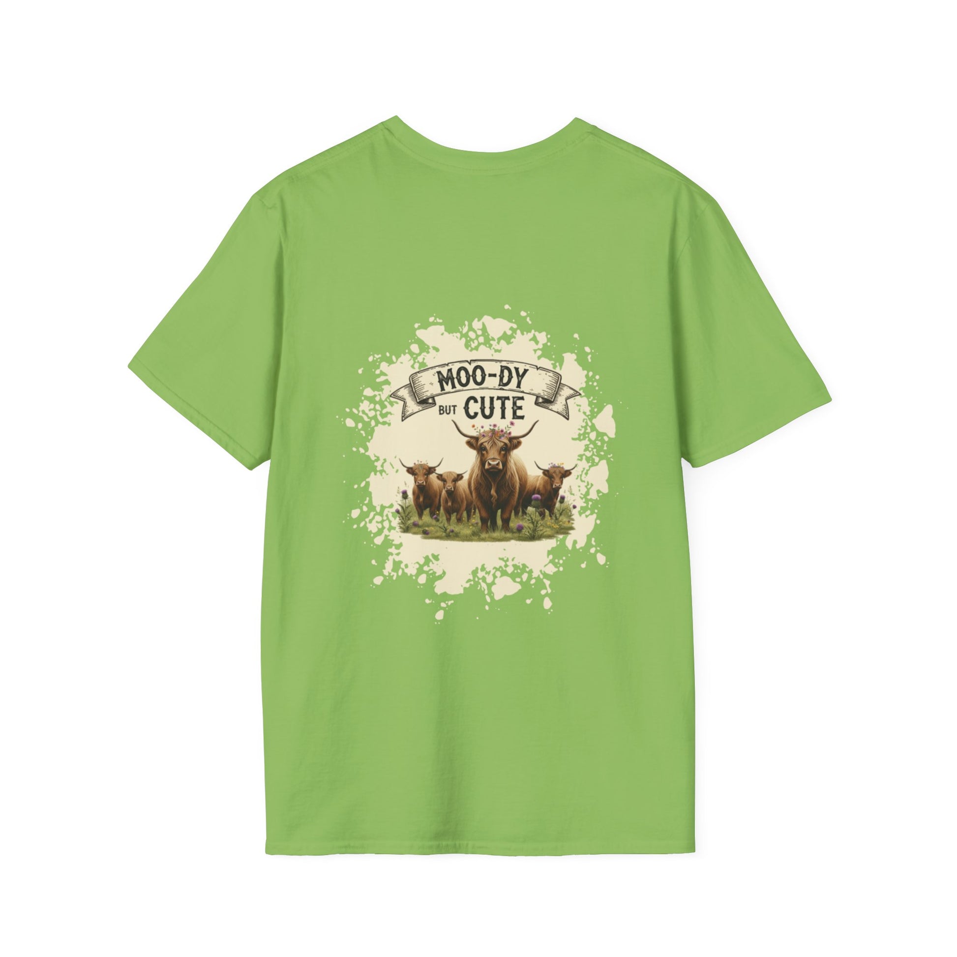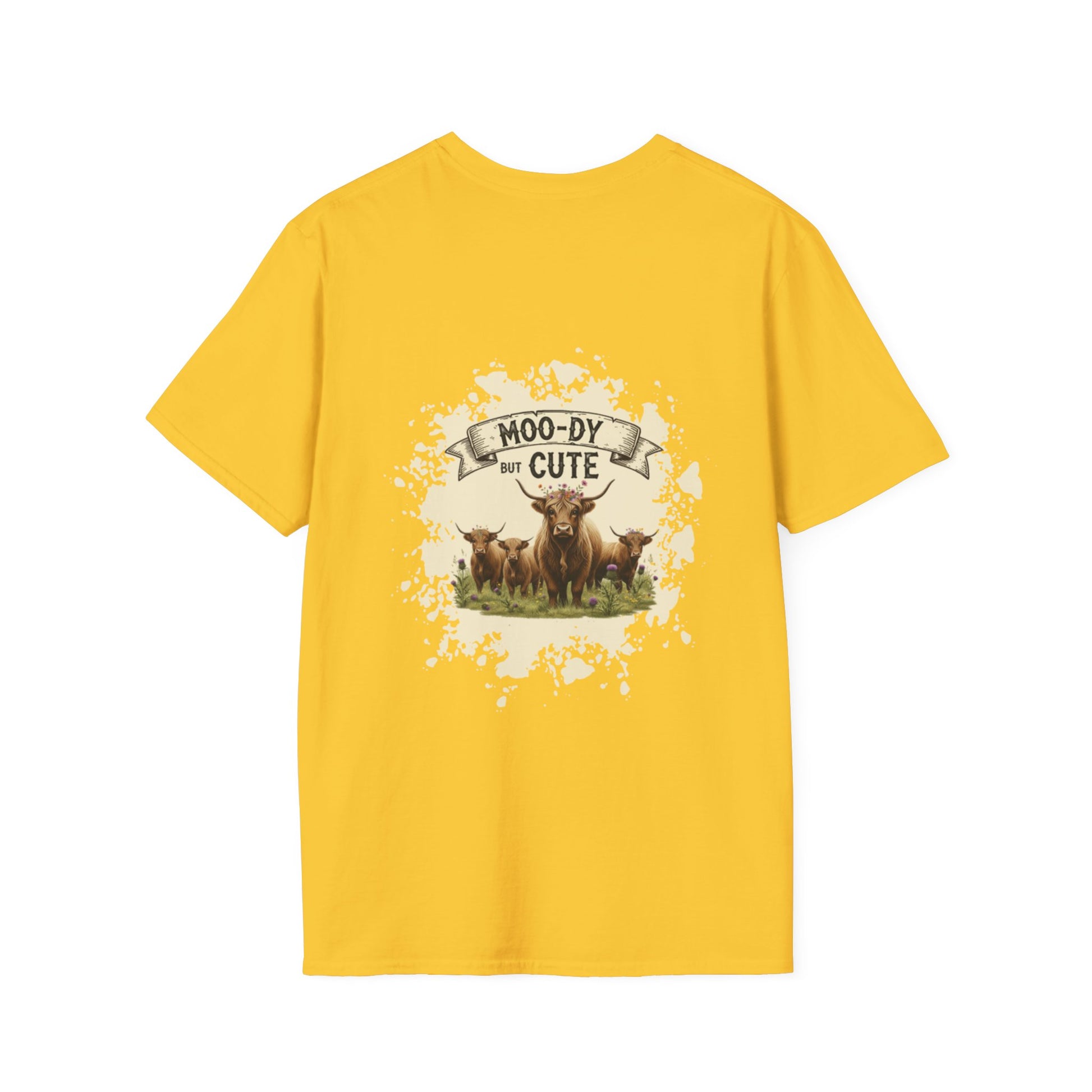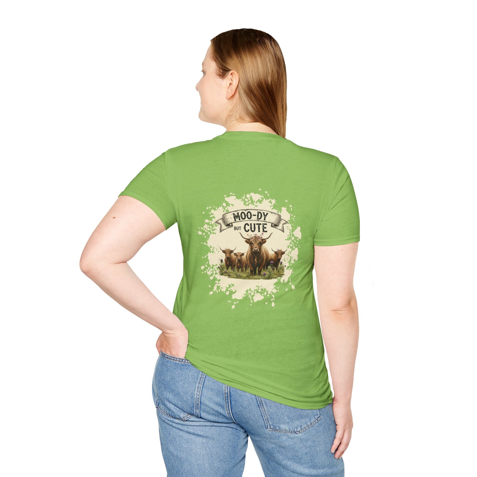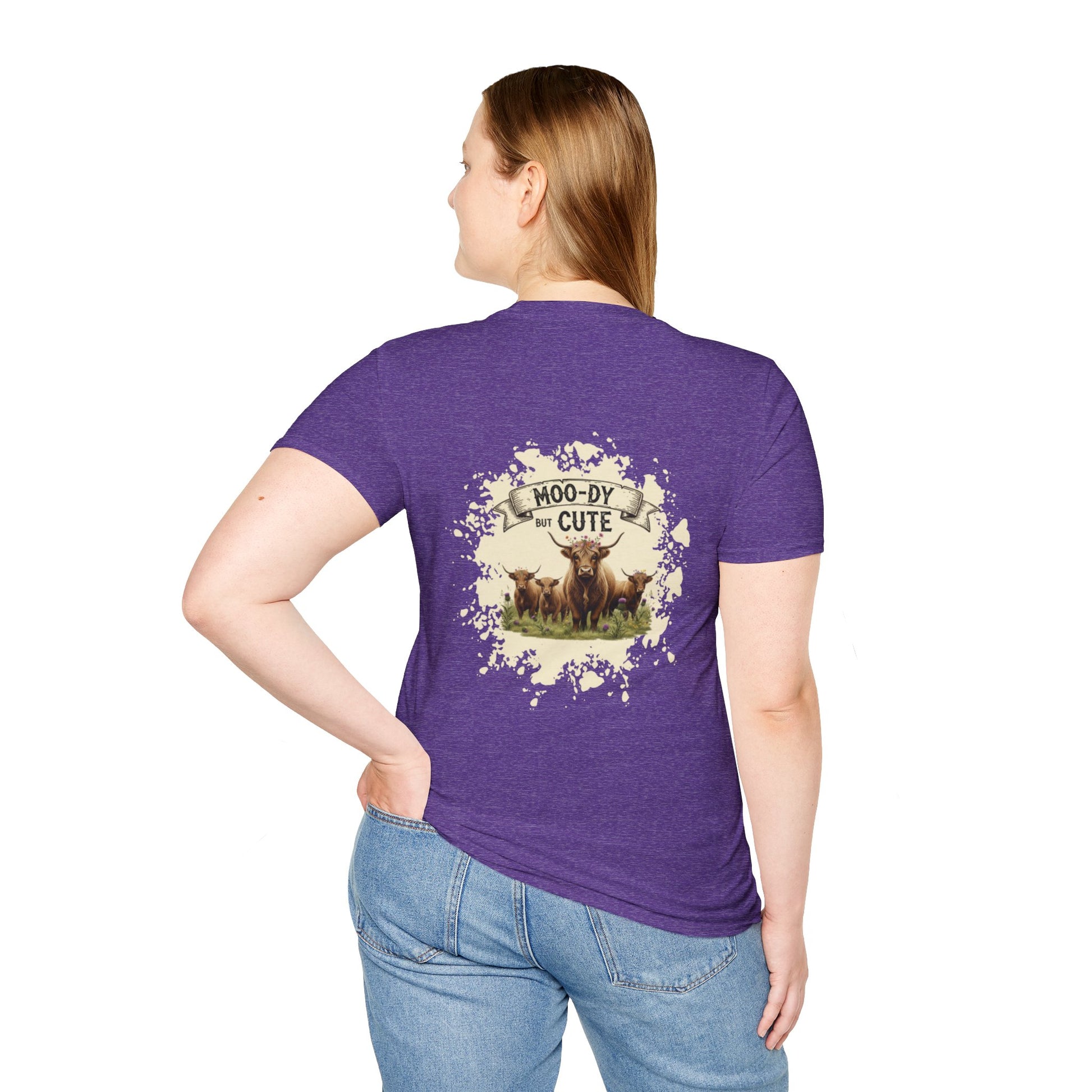 Moo-dy but Cute t shirt featuring highland cows, perfect for those who love animals and want to add a touch of whimsy to their wardrobe. This comfortable and versatile garment is ideal for casual wear and can be a great gift for animal lovers or anyone who enjoys playful designs. Suitable for holidays, birthdays, or any casual occasion.