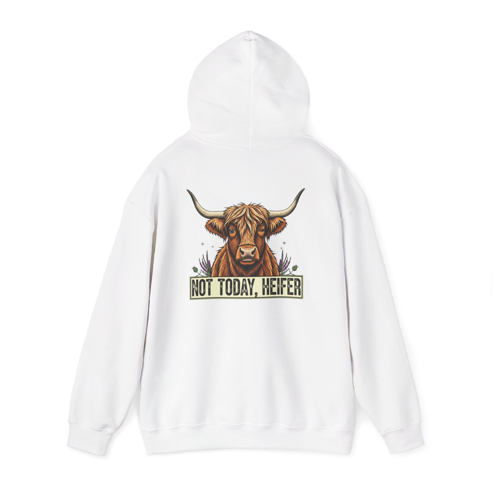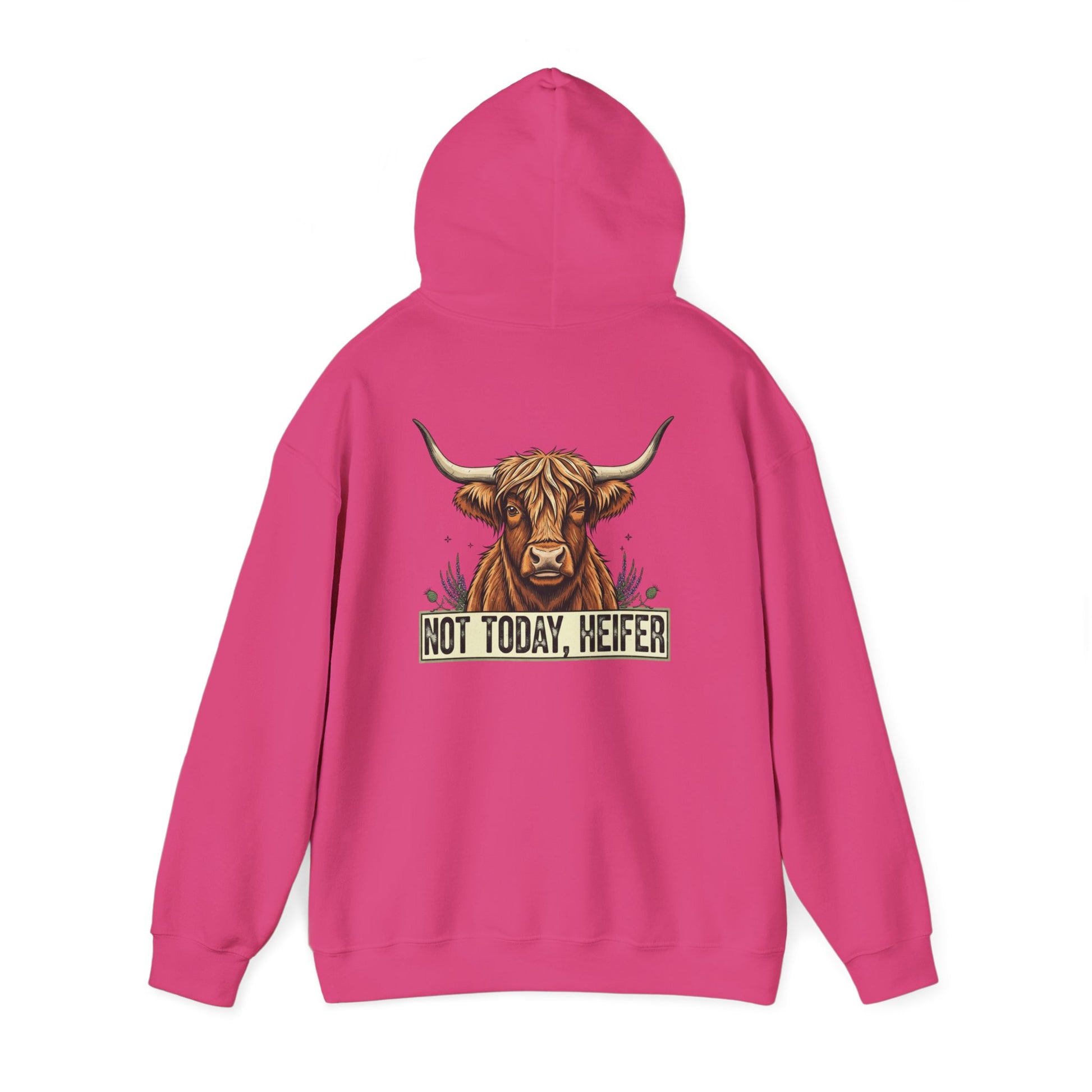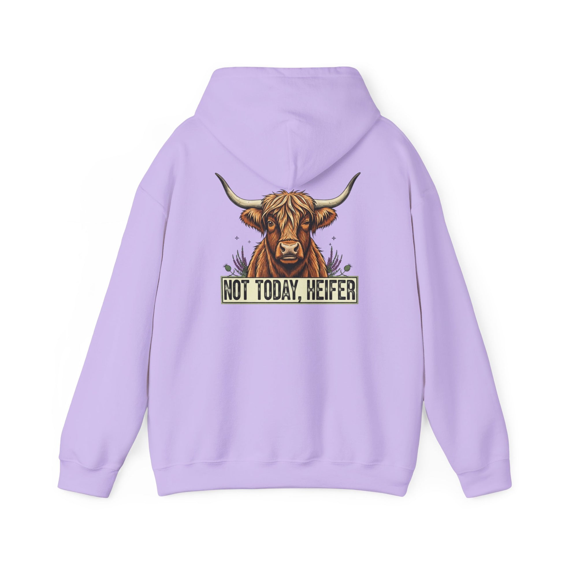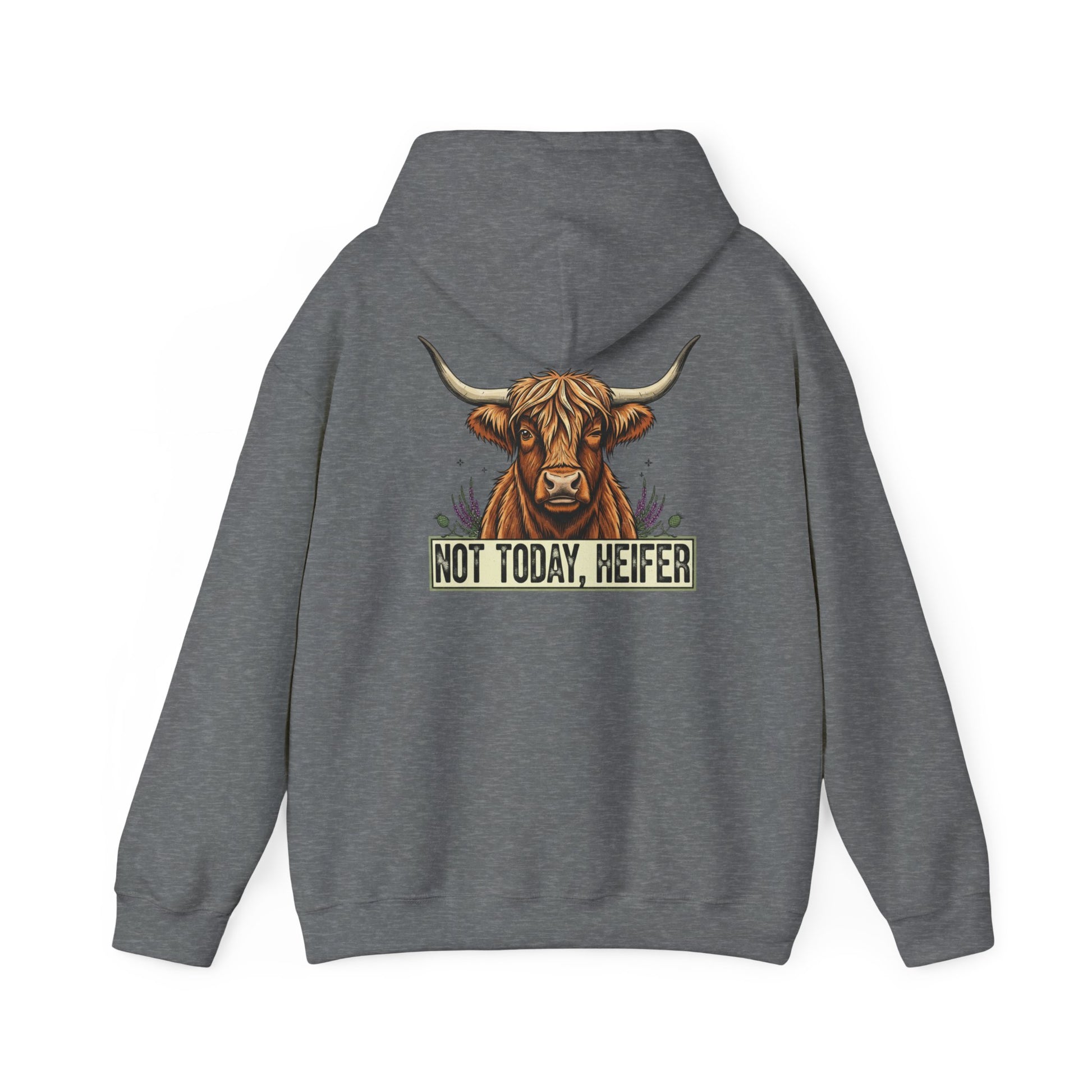 Stay cozy and stylish with this 'Not Today, Heifer' hoodie featuring a highland cow design. This hoodie is perfect for those who love a touch of humor in their wardrobe and is ideal for casual wear during colder days. Great for adults looking for a fun and comfortable piece to add to their wardrobe, perfect for gifting during birthdays and holidays.