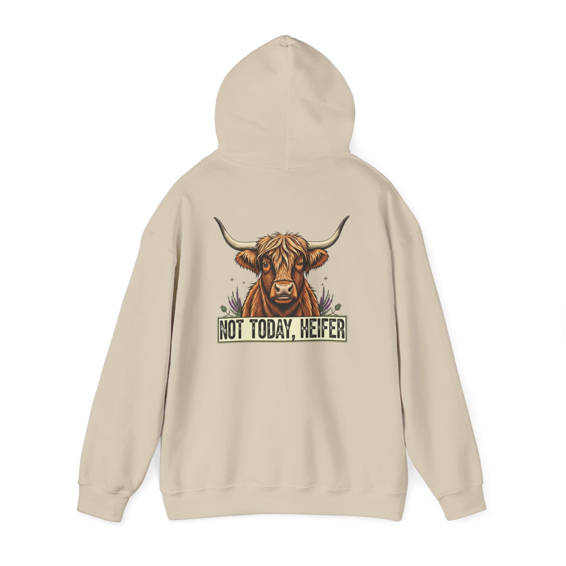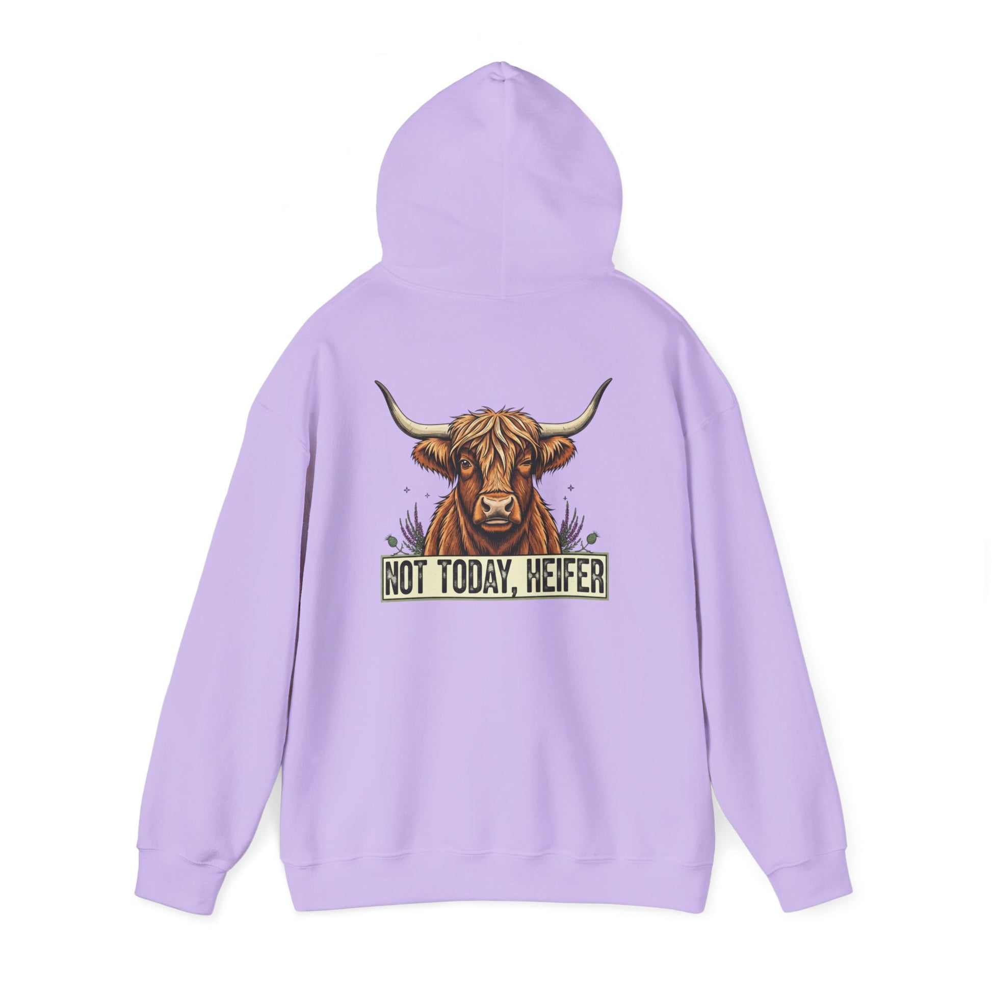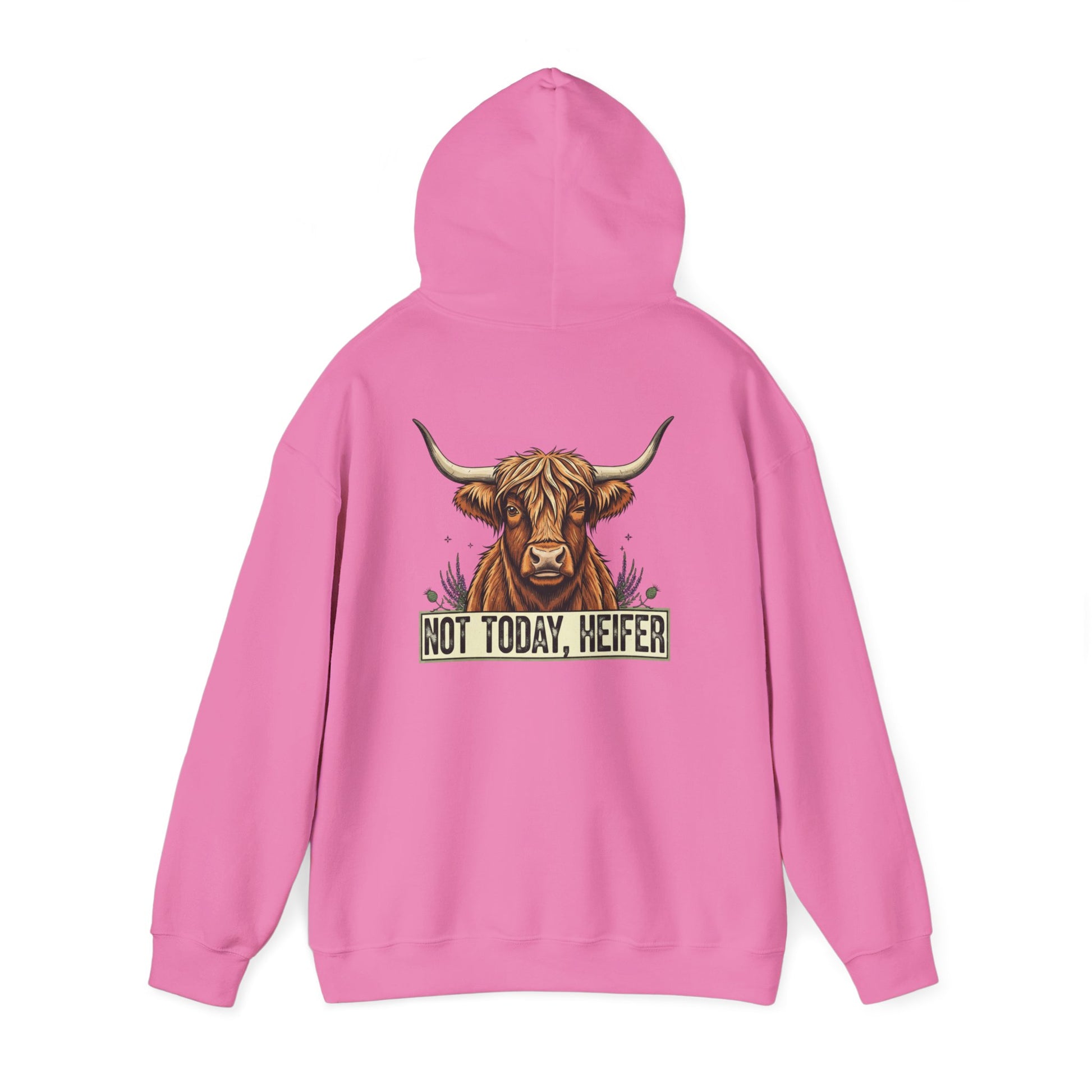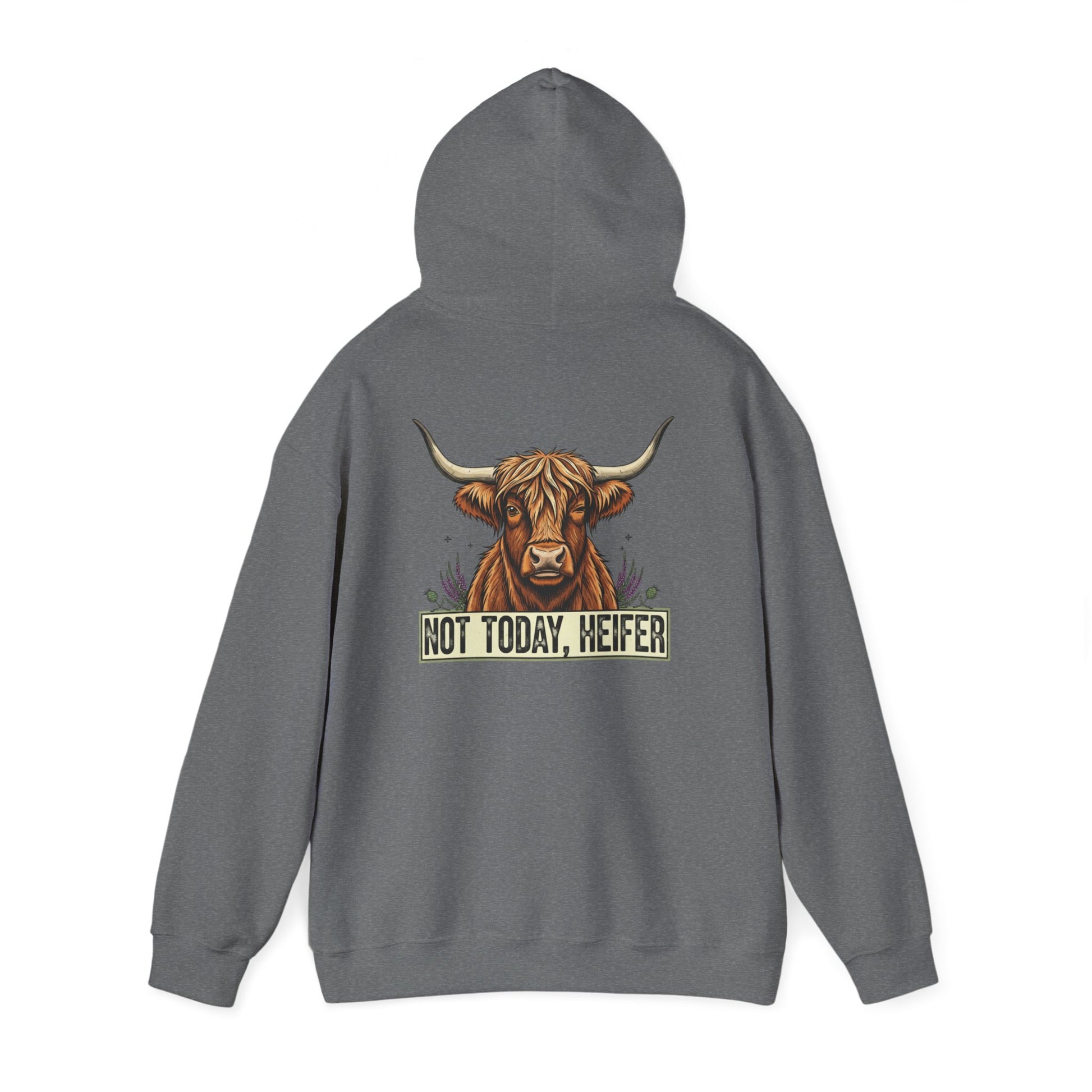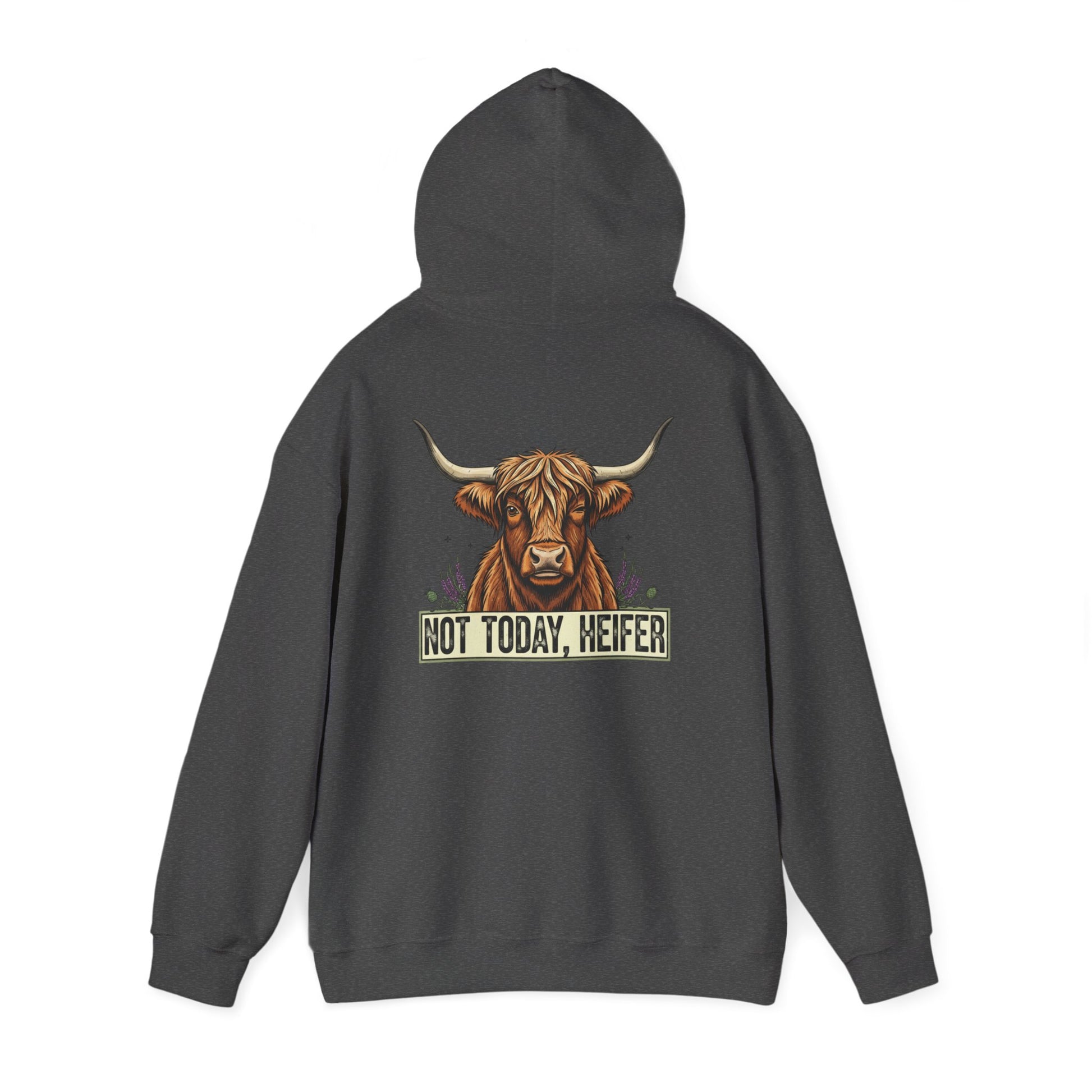 Stay cozy and stylish with this 'Not Today, Heifer' hoodie featuring a highland cow design. This hoodie is perfect for those who love a touch of humor in their wardrobe and is ideal for casual wear during colder days. Great for adults looking for a fun and comfortable piece to add to their wardrobe, perfect for gifting during birthdays and holidays.